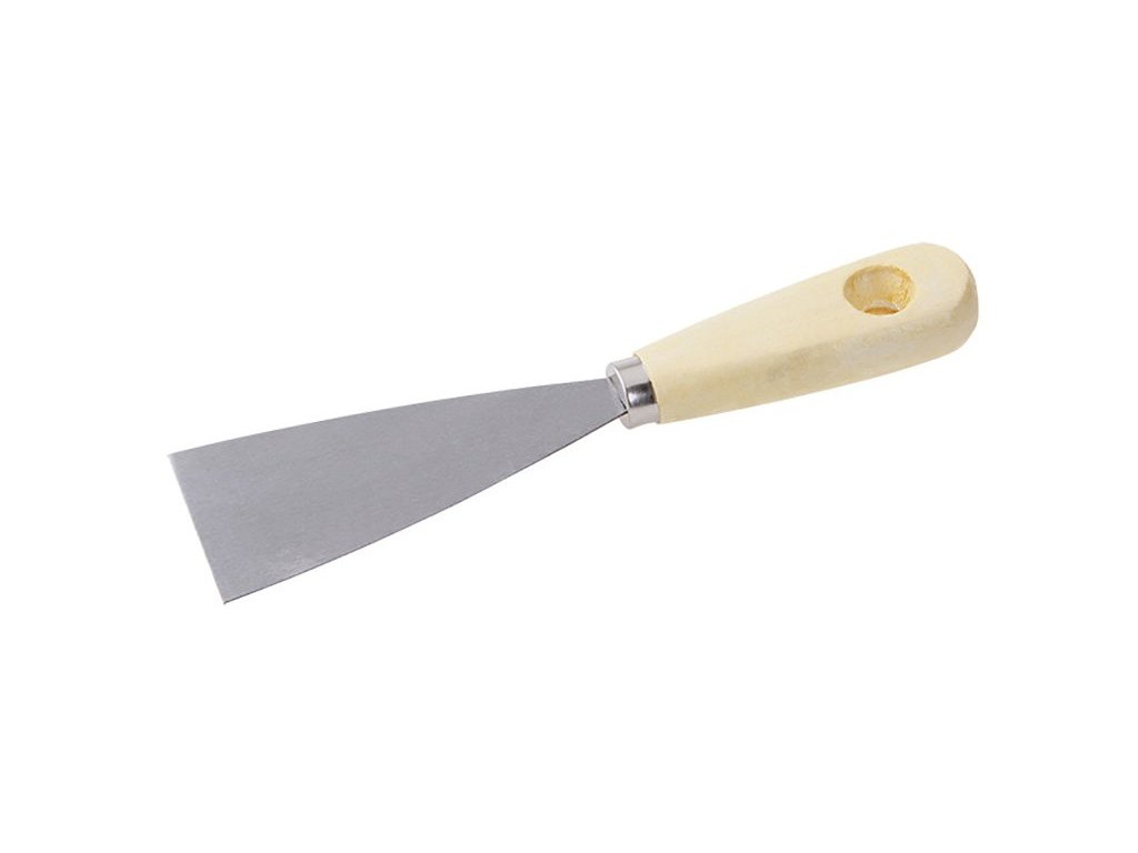 Spatula steel 50 mm with wooden handle. The spatula is used for applying and spreading building plaster, sealants or for cleaning and removing old sealants, paintings or wallpaper. Thanks to the triangular shape, the material is very easy to apply and remove.