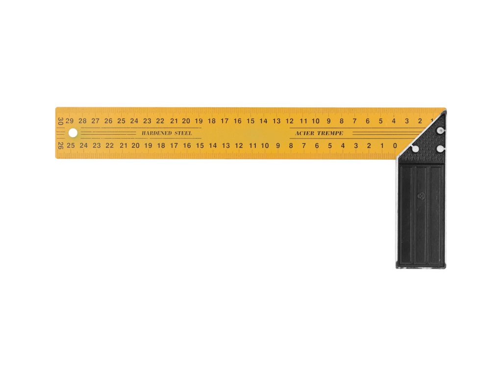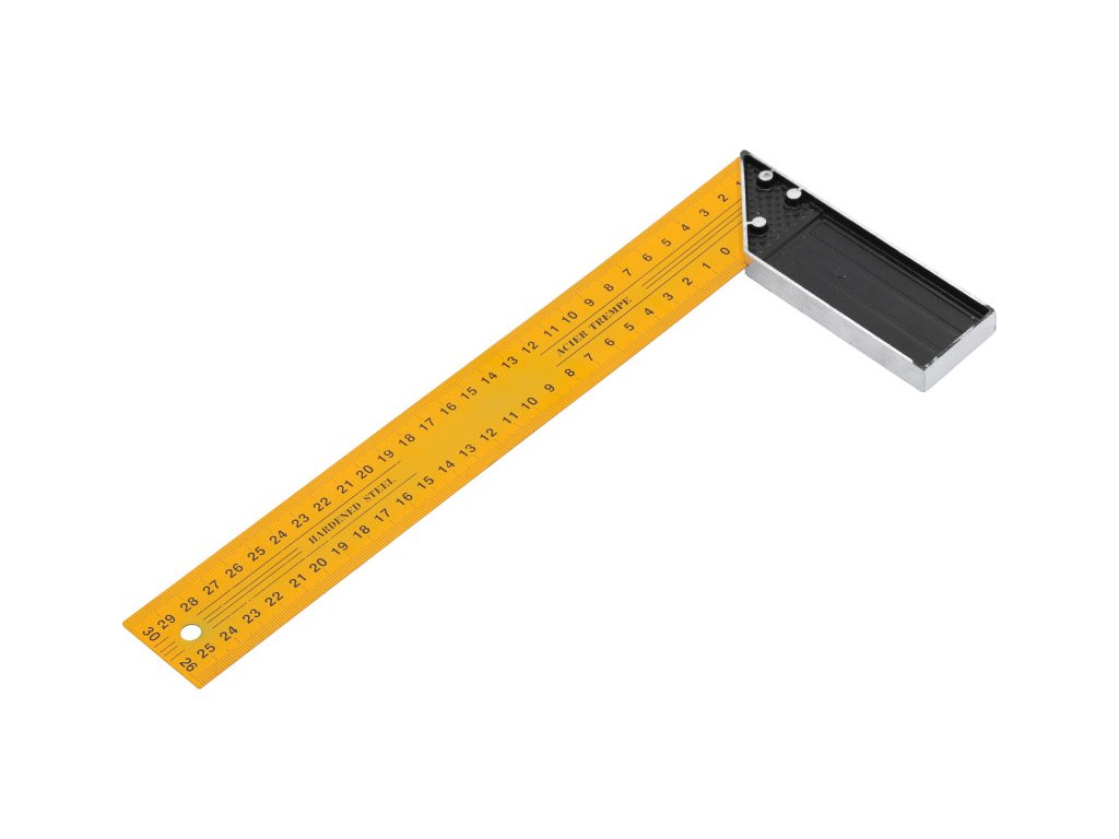 Szögletes sarokvas alumínium talppal és keményített lemezből készült karral. A kar sárgára van lakkozva, jól olvasható fekete milliméteres beosztásokkal. A talp és a kar összeköttetése 45°-os szöget határoz meg.