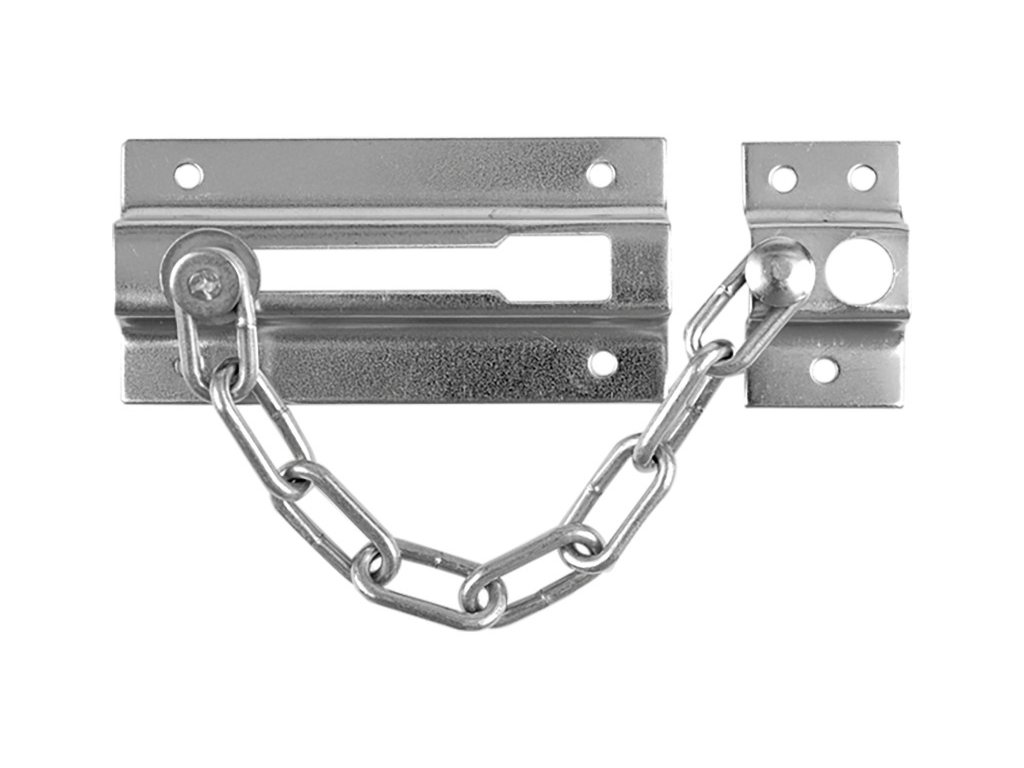 Króm ajtólánc, zárószeg hossza 85mm, a lánc csempéjének hossza 24mm, zárószeg magassága 41mm, lánc csempéjének magassága 41mm, lánc vastagsága 3mm, súly 66g