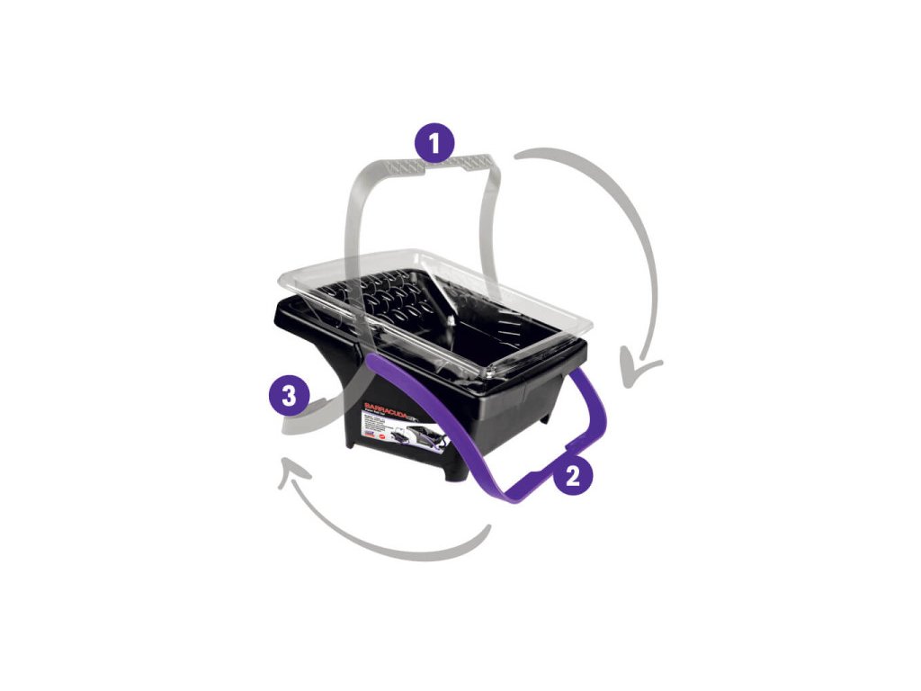 Kapacita: 9 litrov na 10 / 18 / 25 mm valce Trojpolohová nastaviteľná rukoväť Gumové nožičky zabraňujú skĺznutiu Držiak valčeka zabraňuje zašpineniu rukoväte Prehĺbenie v rohu vedra pre ľahké vyliatie farby Materiál odolný voči poškodeniu a prasknutiu Má perforácie na vypustenie farby Vymeniteľné vložky