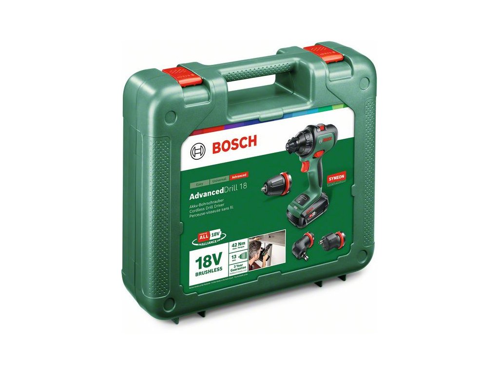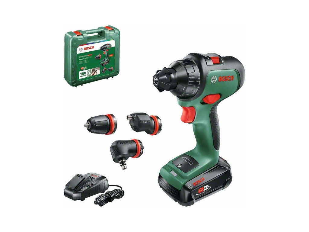 BOSCH AdvancedDrill 18 Akumulátorový vŕtací skrutkovač + Skľučovadlový adaptér (1x2,5Ah) v kufri