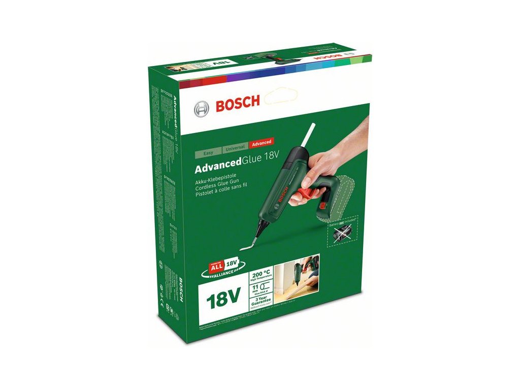 Az AdvancedGlue 18V egy erőteljes, akkus ragasztópisztoly, amely a vezetékes eszközökkel azonos teljesítményt nyújt, és kompatibilis a Bosch 18 V-os akkus rendszerével. A ragasztópisztoly mindössze 90 másodperc alatt felmelegszik és használatra kész. Optimális ragasztást biztosít a tökéletes rögzítéshez, valamint elegendő javítási időt a Bosch egyenletesen magas hőmérsékletet nyújtó melegítési technológiája révén. Két hőmérsékleti üzemmód: 200 °C a tökéletes ragasztásért a barkács- és javítási feladatoknál, valamint 130 °C a hőre érzékeny munkadarabokhoz. Ez az okos szerszám energiát is megtakarít azzal, hogy magától kikapcsol, amikor nincs használatban.
