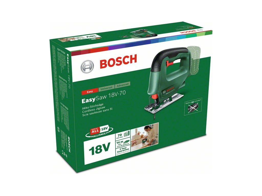 Egyszerű és megbízható, a kompakt EasySaw 18V-70 a megbízható választás beltéri barkácsfeladatokhoz és kreatív projektekhez. Ez a mindössze egy gombbal könnyedén működtethető könnyű szúrófűrész egyenes és ívelt vágásokra képes 70 mm mélységig faanyagban, például fa polcokban vagy laminált padlóban, illetve 6 mm mélységig fémben. További kényelmet jelent a lágy indítást és finom sebességbeállítást biztosító sebességszabályozó gomb. A vágási pontosság biztosításához a fűrészelés vonala a fűrészport eltávolító speciális fúvó funkciónak köszönhetően mindig tiszta marad. A fűrészlap könnyű kioldását beépített SDS rendszer garantálja. Ez a szerszám a POWER FOR ALL ALLIANCE rendszer része. Egyetlen akkumulátorral nagyszámú, különböző márkájú szerszám működtethető.