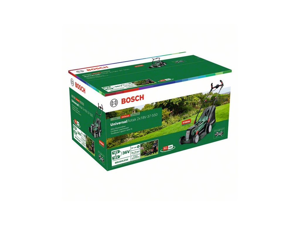 Az akkus UniversalRotak 2x18V-37-550 fűnyíró erejével és kényelmes kezeléssel győz meg. Ideális magas és alacsony fű vágására is a közepes és nagyobb méretű gyepeken a 36 V-os (2 x 18 V) elektronika és a szénkefe nélküli motor kombinációja révén, amely kiváló vágásteljesítményt nyújt és hosszabb élettartamot biztosít. A fűnyíró 37 cm-es vágásszélességgel rendelkezik, a vágásmagasság egyszerűen állítható 25 mm és 70 mm között a központi, 5 fokozatú karos magasságállítással. A hobbikertészek értékelni fogják az Ergoflex fogantyúkat és az összehajtható 40 l-es szövetzsákot, amely a lenyírt füvet a fűnyíró működése közben összegyűjti, valamint a gyűjtőzsák beépített telítetttségjelzőjét, amely jelzi a felhasználónak, ha megtelt a zsák. A beépített Bosch Syneon technológia optimális teljesítményt biztosít maximális üzemidő mellett. Ez a szerszám a 18V POWER FOR ALL ALLIANCE rendszer része-