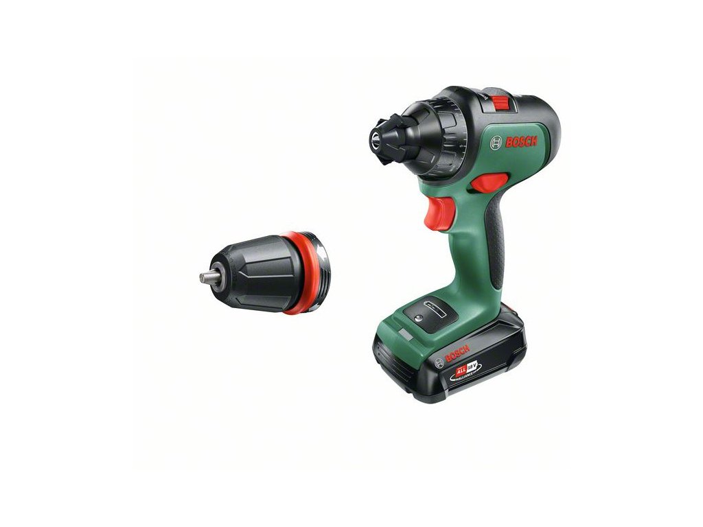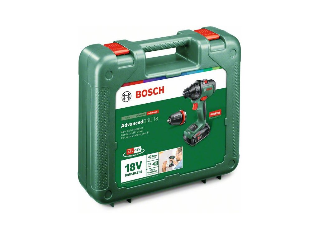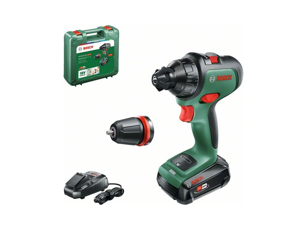 BOSCH Akumulátorový vŕtací skrutkovač AdvancedDrill 18 + Skľučovadlový adaptér v kufri(1 x 2,5 Ah + nabíjačka)