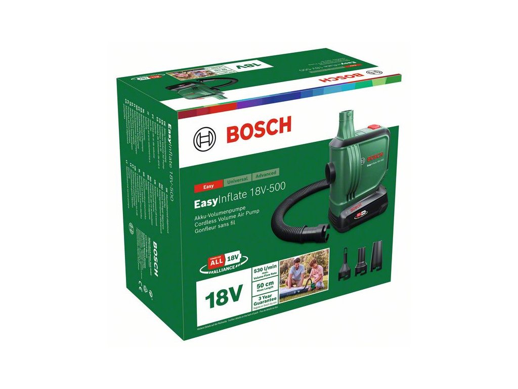 A Bosch EasyInflate 18V-500 akkus légpumpa 530 l/min maximális térfogatáramával a vízi játékok, felfújható csónakok, gumimatracok és más nagy térfogatú tárgyak felfújásának és leeresztésének sebességét új szintre emeli. Az 50 cm hosszú tömlő és az egyszerű be/ki kapcsoló kényelmes működtetést biztosít. A kompakt pumpához háromféle adapter van mellékelve a különböző méretű szelepekhez, és egy táska, amelyben minden egyszerűen elvihető a medencéhez, a tóhoz vagy a kempingezéshez. Ez a nagy térfogatokhoz alkalmas pumpa a 18V POWER FOR ALL ALLIANCE rendszer része. Egyetlen akkumulátor minden 18V POWER FOR ALL szerszámhoz.