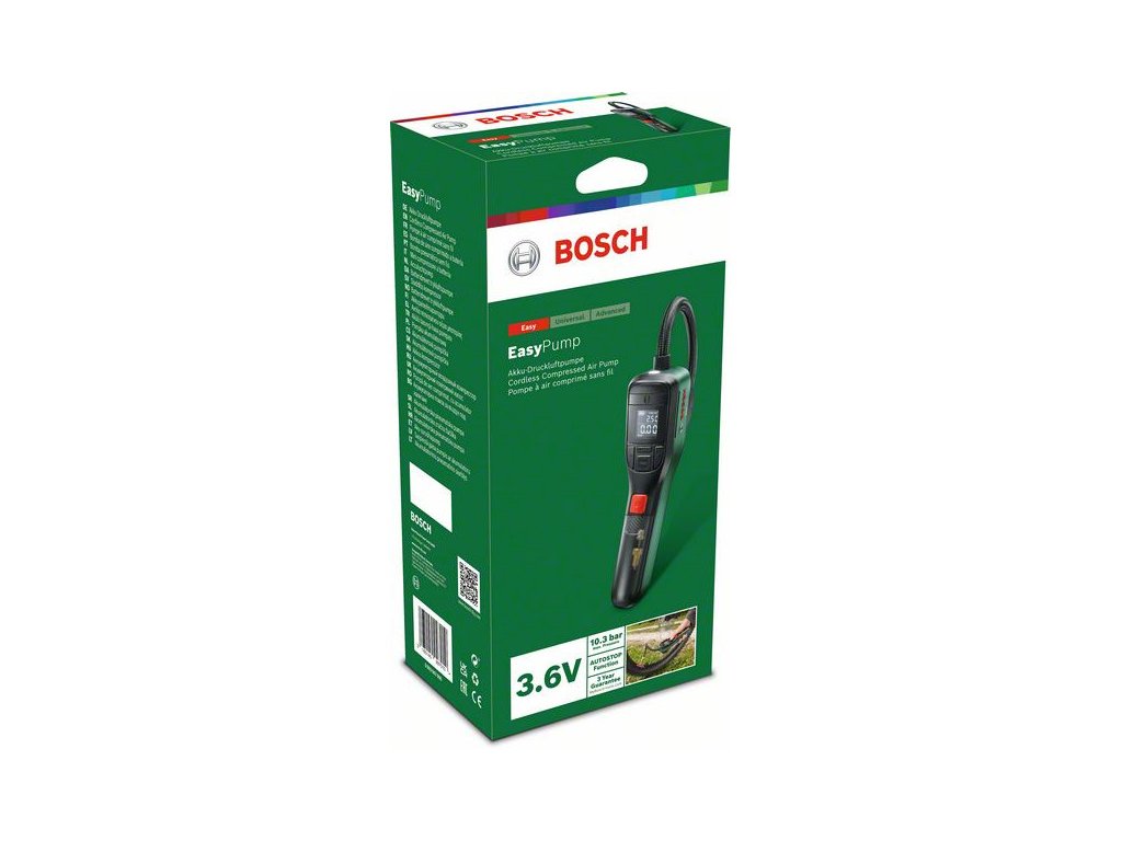 Kis méret, nagy teljesítmény: az EasyPump a Bosch felhasználóbarát pumpája különféle feladatokhoz max. 10,3 bar nyomásig. A termék valós idejű mérési funkciója és a gyári beállítások kényelmes és pontos felfújást biztosítanak. A pumpa könnyen használható felhasználói felülettel és nagy kijelzővel rendelkezik, amely nappali fényben is jól olvasható. Kompakt és könnyű kialakításának köszönhetően egyszerűen hordozható, ideális segítőtárs. A tárolórekeszben precízen elhelyezhető adaptereknek köszönhetően az EasyPump segítségével mindenféle abroncs (pl. autó, kerékpár), labda (pl. focilabda) vagy akár kisebb vízisport-eszközök is felfújhatók. Felfújás minden eddiginél egyszerűbben.