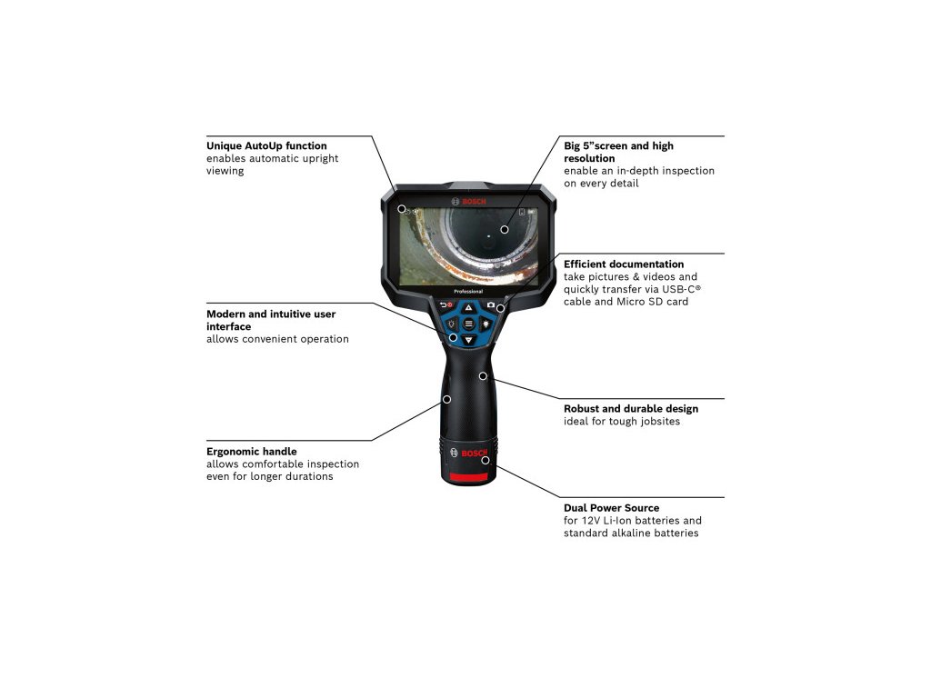 A GIC 12V-5-27 C Professional vizsgálókamera újszerű kényelmet biztosít épületgépészek és vízvezeték-szerelők, autószerelők, villanyszerelők számára.