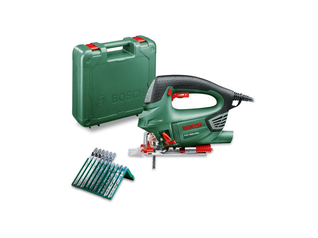 BOSCH Priamočiara píla PST 900 PEL s oblúkovou rukoväťou v kufri / 620 W + 10-dielna sada pílových listov