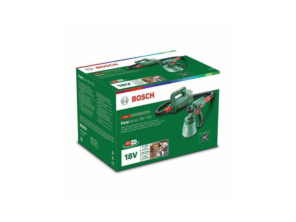 A kisebb és közepes barkácsolás során a lakkozás és fényezési projektekhez a Bosch EasySpray 18V-100 akkus festékszóró szolgáltat kiváló eredményeket. Könnyűsége és a nagy teljesítményű 18 V Li-ion akkumulátor révén ez a festékszóró a gyors munkavégzéshez és a maximális mobilitáshoz készült..