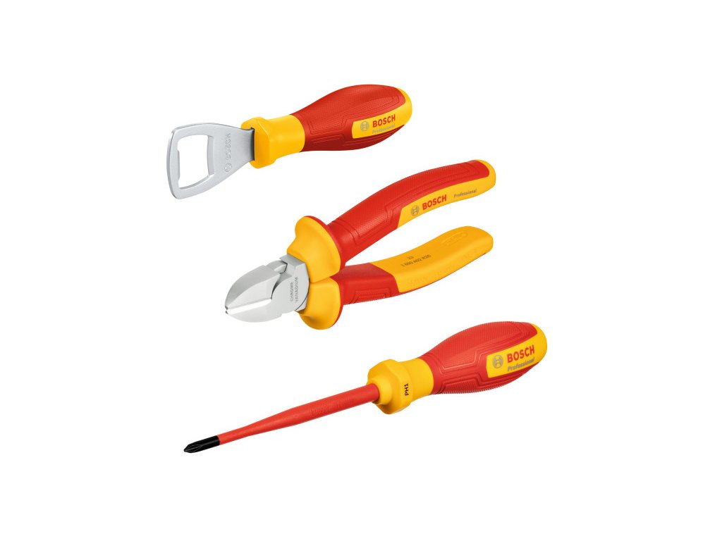 Limitovaná edícia 3 nástrojov: 1 skrutkovač VDE, 1 bočný rezák VDE a 1 otvárač na fľaše Otvárač na fľaše je dostupný iba v tejto súprave 2 nástroje VDE sú certifikované podľa DIN EN/IEC 60900