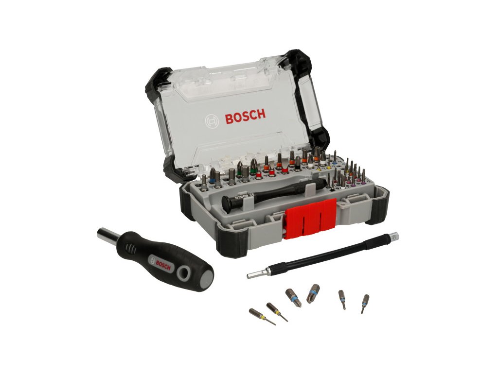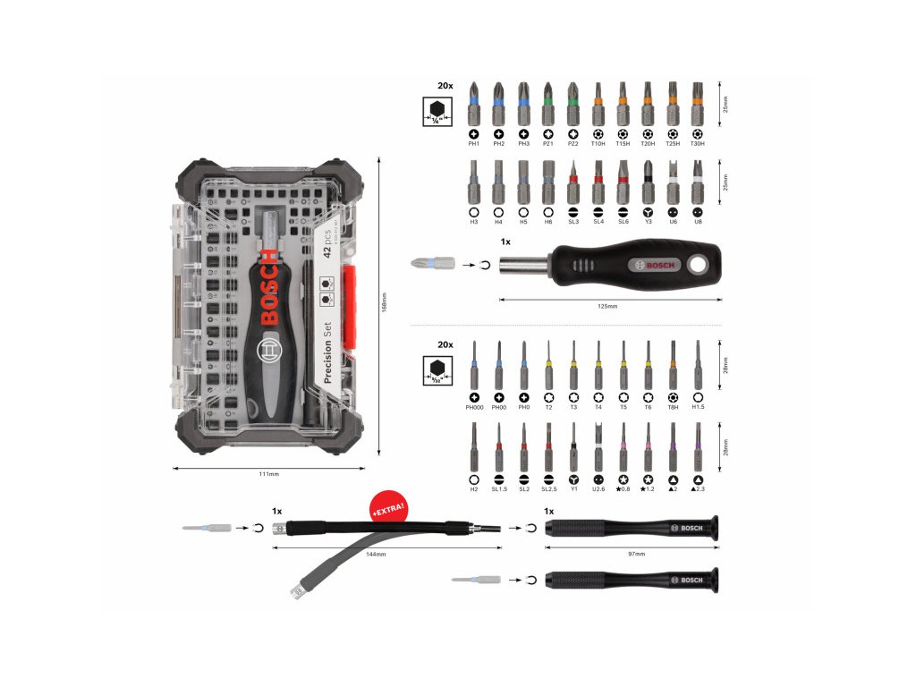 42+1 db készlet tartalma: PH000; PH00; PH0|T2; T3; T4; T5; T6|T8H|H1.5; H2|SL1.5; SL2; SL2.5|Y1|U2.6|☆0.8; ☆1.2|△2; △2.3|25 mm-es betéthelyes csavarbit:|PH1; PH2; PH3|PZ1; PZ2|T10H; T15H; T20H; T25H; T30H|H3; H4; H5; H6|SL3; SL4; SL6|Y3|U6; U8|Csavarhúzó nyél:|Normál bitnyél, 125 mm|Precíziós bitnyél, 90 mm