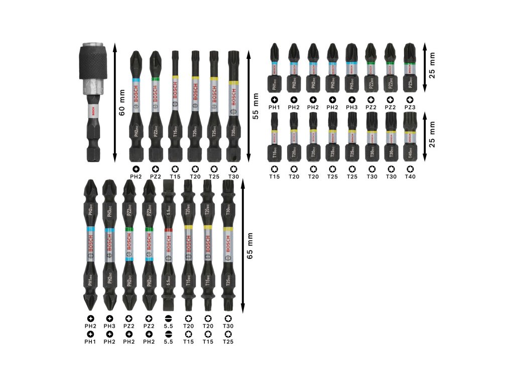 55 mm-es csavarbit: PH2|PZ2|T15; T20; T25; T30