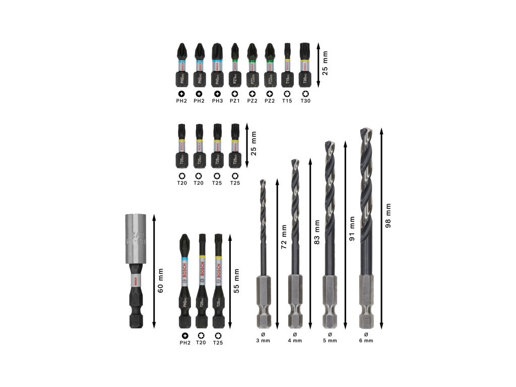 Sada obsahuje: skrutkovací bit 25 mm: PH2 (2 ks); PH3PZ1; PZ2 (2 ks) T15; T20 (2 kusy); T25 (2 ks); skrutkovací bit T3055 mm: PH2T20; Držiak bitov T2560 mm Kovová príklepová vŕtačka HSS-G: 3; 4; 5; 6 mm