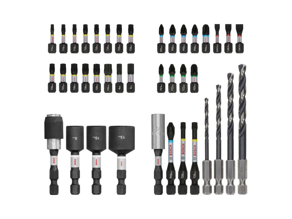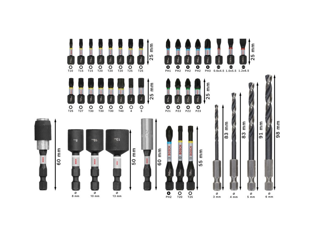 Sada obsahuje: 25 mm skrutkovací bit: PH1; PH2 (3 kusy); PH3PZ1; PZ2 (2 kusy); PZ3T10; T15 (2 kusy); T20 (3 kusy); T25 (3 ks); T27; T30 (3 kusy); T40H4; H5SL4,5; SL5,5; SL6.555mm skrutkovací bit:PH2T20; Nástrčný kľúč T2550 mm: 8; 10; 13 mm Držiak bitov 60 mmRýchlovýmenný držiak bitovKovová príklepová vŕtačka HSS-G:3; 4; 5; 6 mm