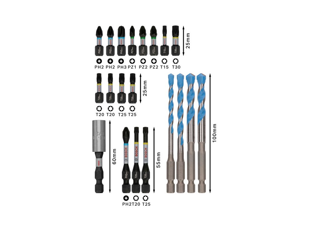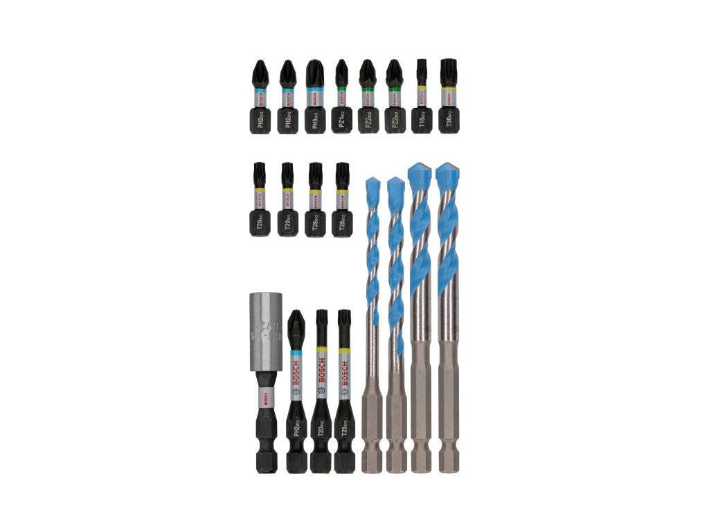 Sada obsahuje: skrutkovací bit 25 mm: PH2 (2 ks); PH3PZ1; PZ2 (2 ks) T15; T20 (2 kusy); T25 (2 ks); skrutkovací bit T3055 mm:PH2;T20; Držiak bitov T2560 mm: EXPERT HEX-9 Multi Construction vrták: 5; 6; 8 mm