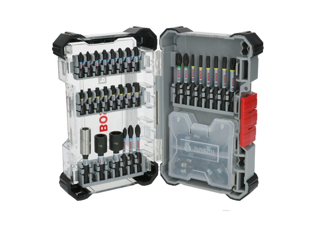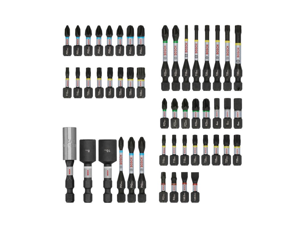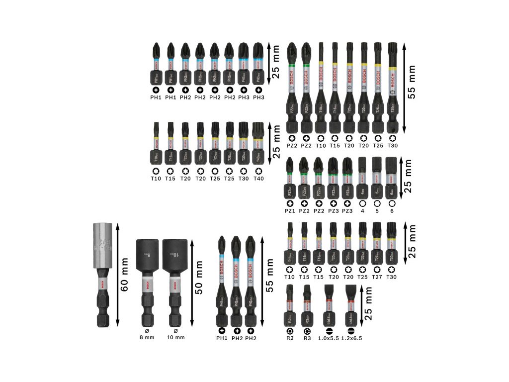 Sada obsahuje: 25 mm skrutkovací bit: PH1 (2 ks); PH2 (4 kusy); PH3 (2 ks) PZ1; PZ2 (2 kusy); PZ3 (2 ks) T10 (2 ks); T15 (3 ks); T20 (4 kusy); T25 (3 ks); T27; T30 (2 ks); T40H4; H5; H6SL5,5; SL6.5R2; R355 mm skrutkovací bit: PH1; PH2 (2 ks) PZ2 (2 ks) T10; T15; T20 (2 kusy); T25; T3050 mm nástrčný kľúč: 8 mm; Držiak bitov 10 mm 60 mm
