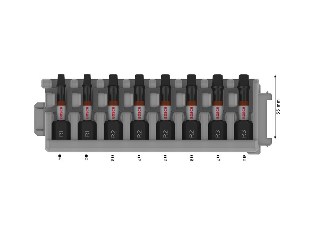 Výkonné skrutkovanie Zvýšená torzná zóna absorbuje napätie spôsobené krútiacim momentom na hrote vrtáka 1/4 nárazuvzdorné šesťhranné skľučovadlo na použitie v príklepových uťahovákoch a vŕtačkách a skrutkovačoch Veľkosti: R1 (2 ks), R2 (4 ks), R3 (2 ks) Dĺžka: 55 mm