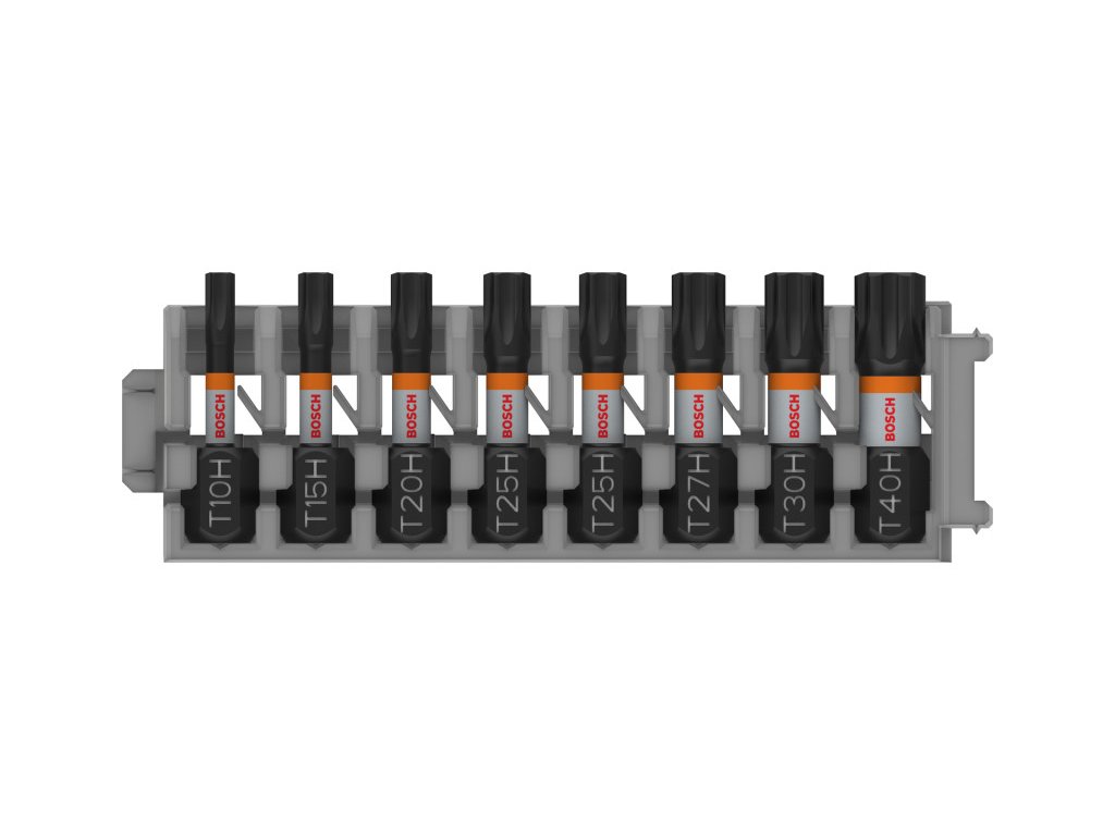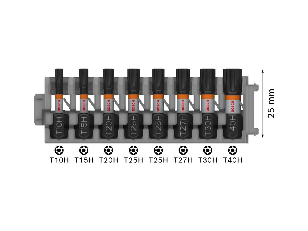 Výkonné skrutkovanie Zvýšená torzná zóna absorbuje napätie spôsobené krútiacim momentom na hrote vrtáku 1/4 nárazuvzdorné šesťhranné skľučovadlo na použitie v príklepových skrutkovačoch a vŕtačkách a skrutkovačoch Veľkosti: T10H, T15H, T20H, T25H, T27H , T30H, T40HH Dĺžka: 25 mm