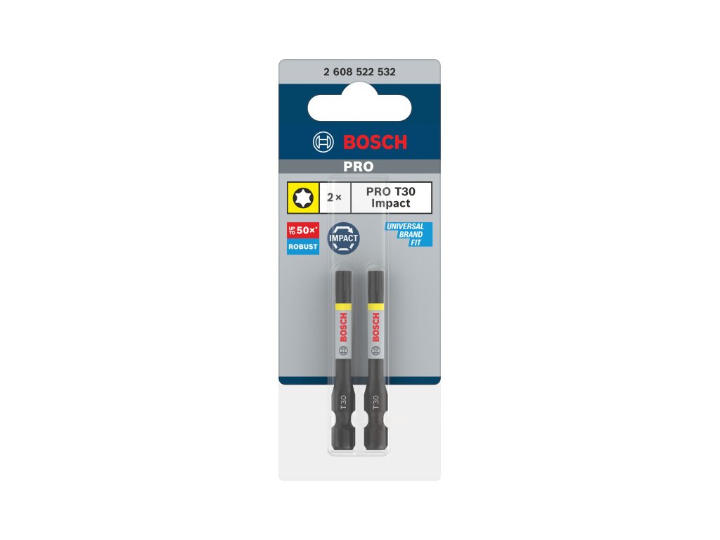 A Bosch PRO Impact T25 bithegy nagy igénybevételű csavarozási munkákhoz készült. Az 55 mm hosszúságú bit ideális mélyebb furatokhoz és nehezen elérhető helyekhez. Kifejezetten ütvecsavarozókhoz fejlesztették, így nagy nyomaték mellett is hosszú élettartamot biztosít.