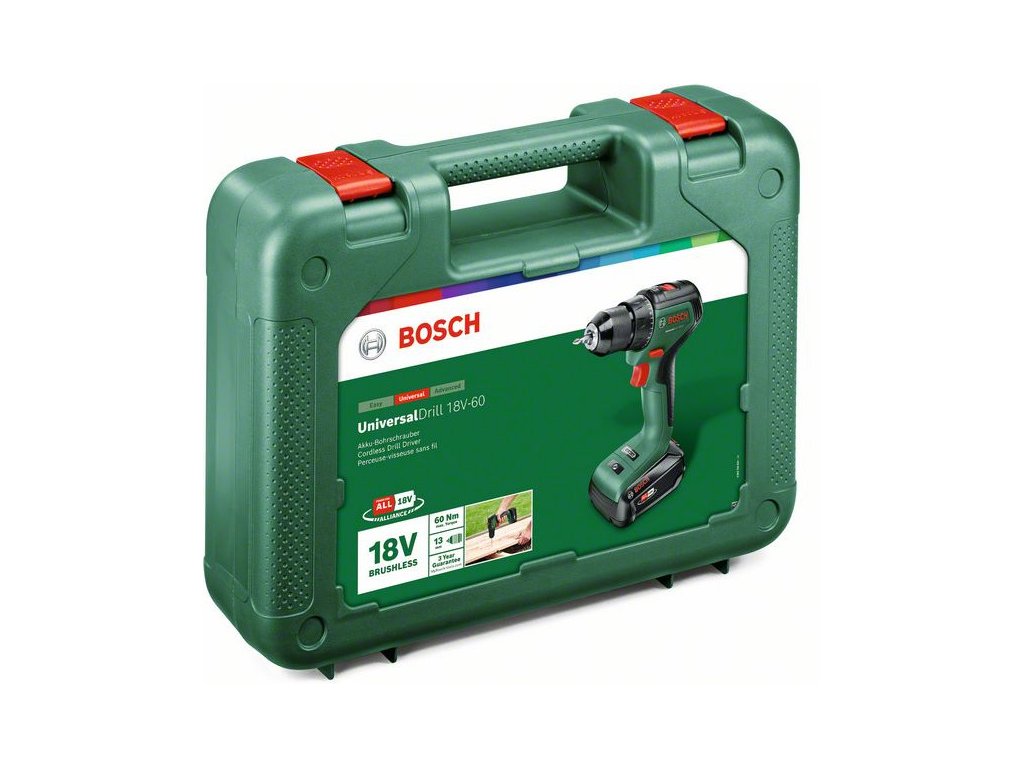 Hosszú ideig tartó fúrási és csavarozási munkákhoz a UniversalDrill 18V-60 a legjobb választás. A szénkefe nélküli motortechnológia hatékony működést és hosszabb üzemidőt biztosít. A minőségi, 13 mm-es fém tokmány a betétszerszámot biztosan tartja, ugyanakkor a csere könnyedén elvégezhető..