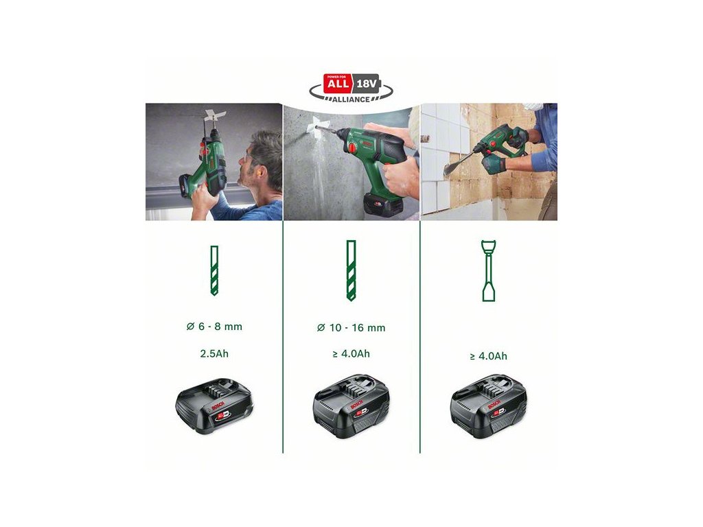 Ezzel az akkus erőművésszel a fúrás is élvezetes: nagy ütőerő, egyszerű használat, rugalmas felhasználás. A 2,0 J ütőerővel bíró Bosch pneumatikus ütőmechanizmus ideális akár 16 mm átmérőjű furatok készítéséhez is betonban – SDS plus fúrószárral. Ez a lenyűgöző erő csempe leveréséhez és kábelcsatornák véséséhez is elegendő. A könnyű és kompakt méretű szerszámmal az elhúzódó munkák kevésbé fárasztóak a barkácsolók számára. A rezgéscsillapításnak és forgásvezérlésnek köszönhetően a szerszám kevésbé rezeg és sokkal stabilabb.