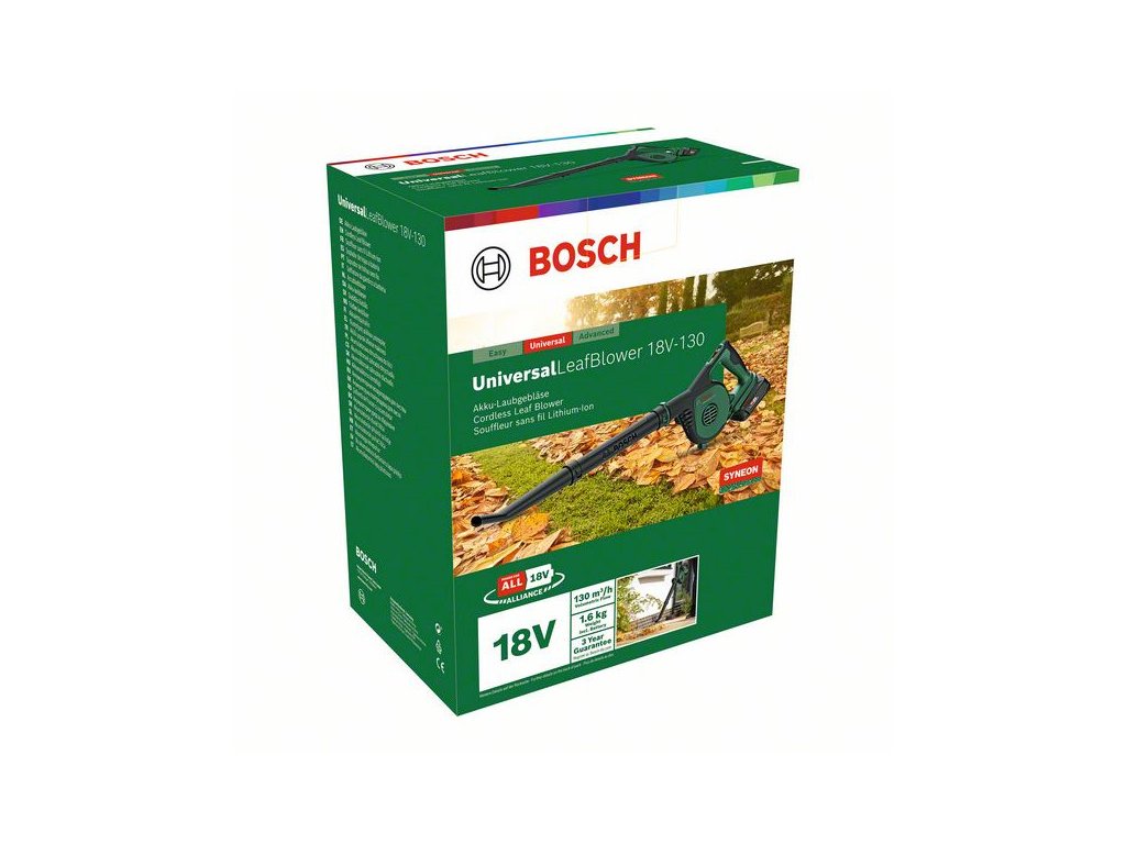 Gyűjtsd össze a kerti hulladékot könnyedén az akkus UniversalLeafBlower 18V-130 lombfúvóval! A könnyű és kompakt lombfúvó ergonomikus fogantyúval rendelkezik, könnyedén elvihető a kert legtávolabbi sarkaiba is. Egyszerű, 2 fokozatú kapcsolóval rendelkezik, amellyel a légáram a nagyobb teljesítményről a jobban irányított tisztításra váltható. A Bosch 18V POWER FOR ALL akkumulátor és a Syneon technológia együtt meggyőző, 245 km/h sebességű légáramot és nagy teljesítményt biztosít. A többféle fúvókatartozékkal sokoldalúan, rugalmasan használható a kerttakarításhoz. Az egyszerűen összeszerelhető és kompakt módon tárolható lombfúvó akár 18 percig is működik teljesen feltöltött állapotban. A beépített Bosch Syneon Electronic védi a szerszámot és az akkumulátort. Ez a szerszám a 18V POWER FOR ALL ALLIANCE rendszer része. Egyetlen akkumulátor minden 18V POWER FOR ALL szerszámhoz-