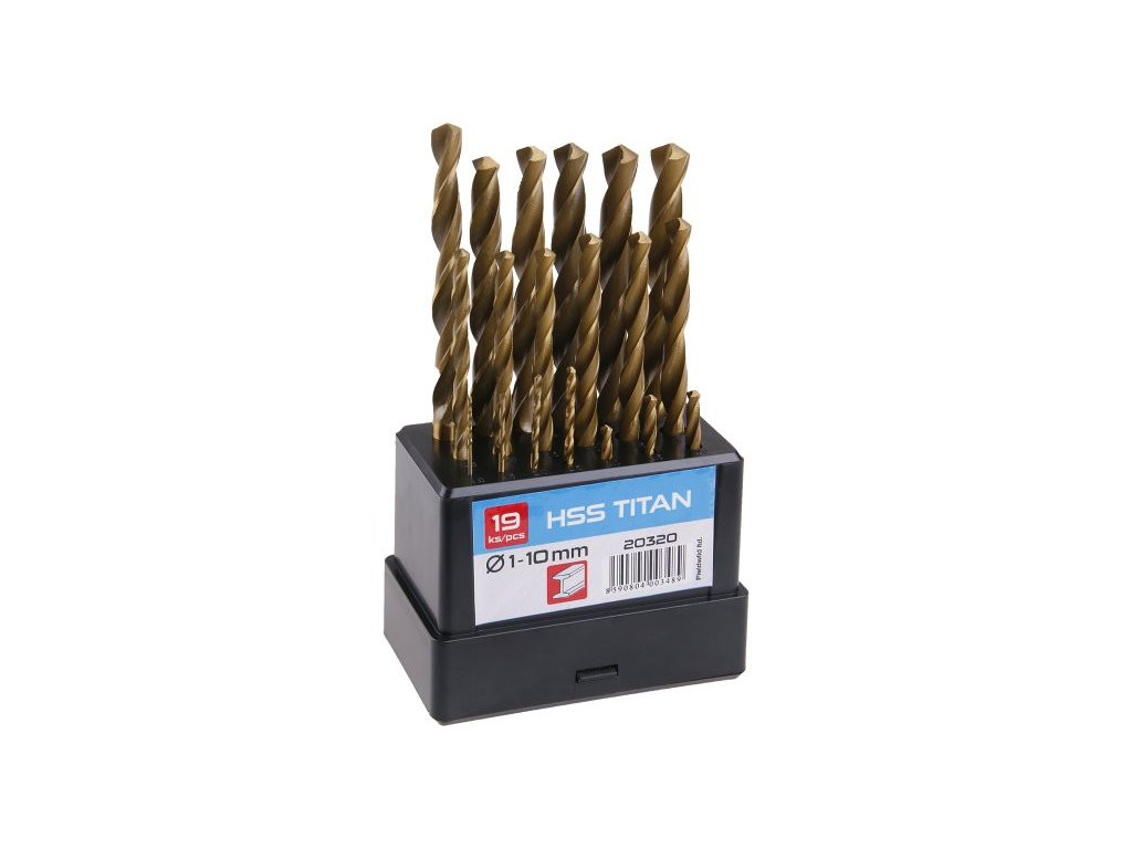 HSS drill set DIN 338, RN with TiN protective layer against abrasion, is made of high-quality high-speed steel (HSS). Precision manufactured helix for quality performance, accuracy and good centering, drill tip angle grinding 118°, for drilling ordinary structural steel, packed in a PVC box.