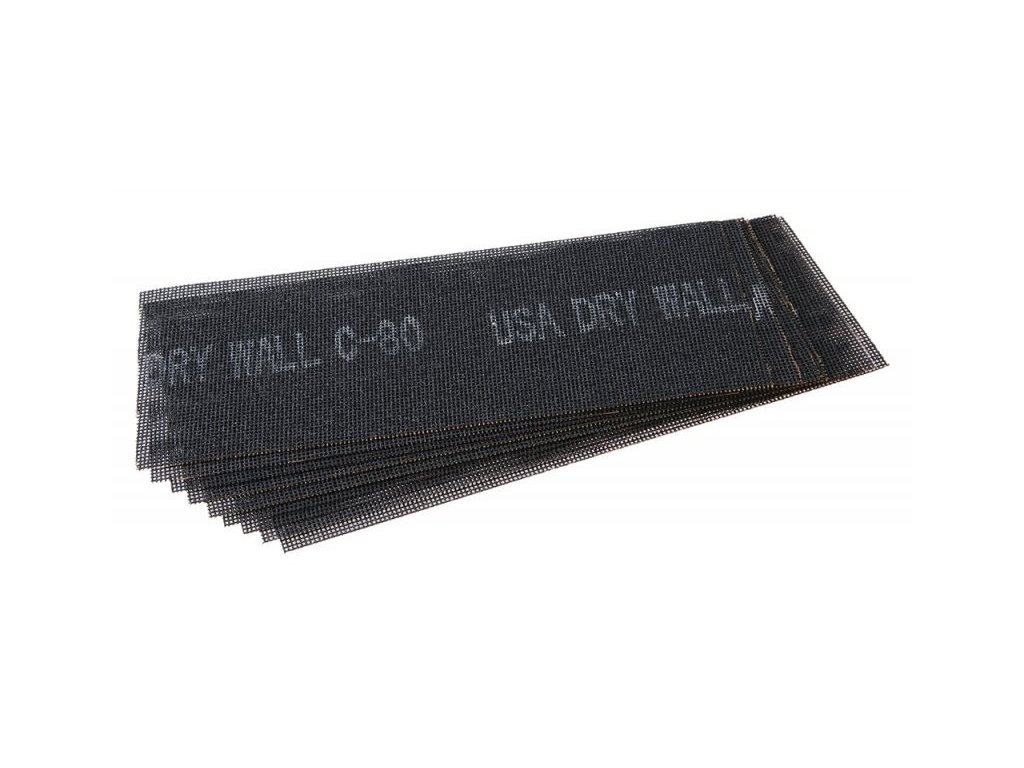Sanding grid 115 x 290 mm, grit 80, 10 pcs/set. , supporting fabric made of glass fibers, resin-glued abrasive grains of silicon carbide coated antistatically, suitable for sanding plasterboard jointing compounds and other materials, the advantage of the grid structure compared to ordinary sanding papers is that it does not get clogged with sanded material.