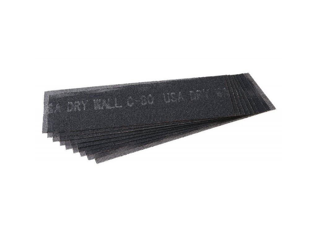 Sanding grid 93 x 290 mm, grit 80, 10 pcs/set. , supporting fabric made of glass fibers, resin-glued abrasive grains of silicon carbide coated antistatically, suitable for sanding plasterboard jointing compounds and other materials, the advantage of the grid structure compared to ordinary sanding papers is that it does not get clogged with sanded material.
