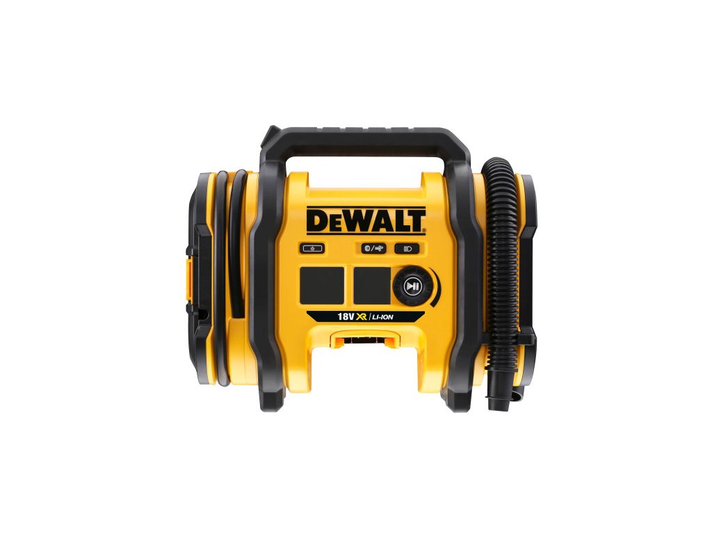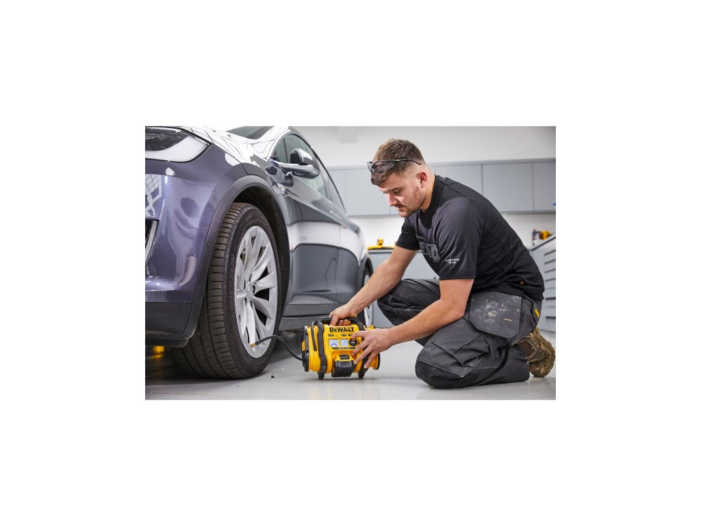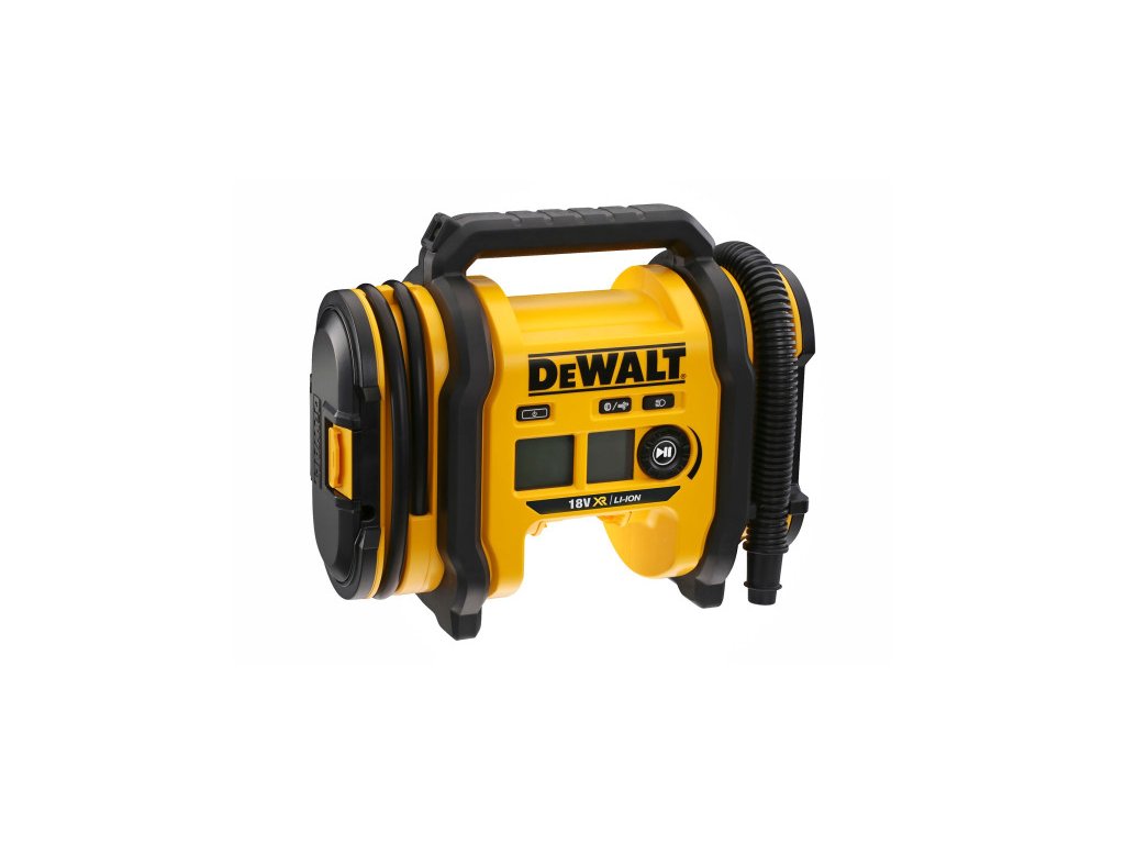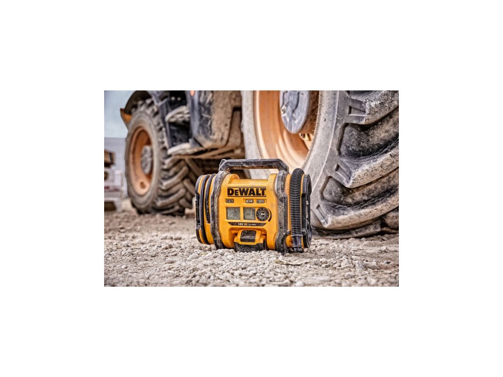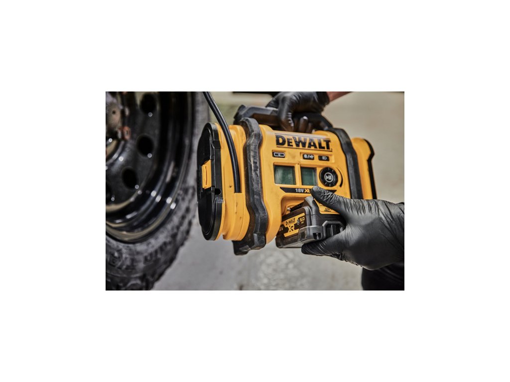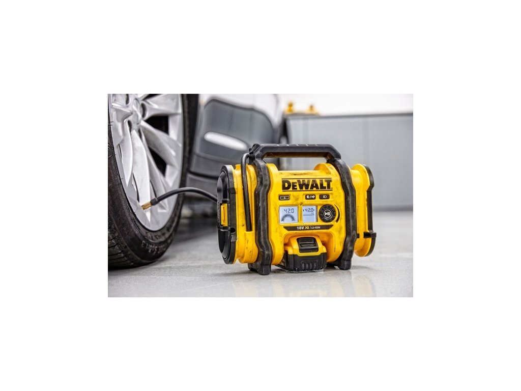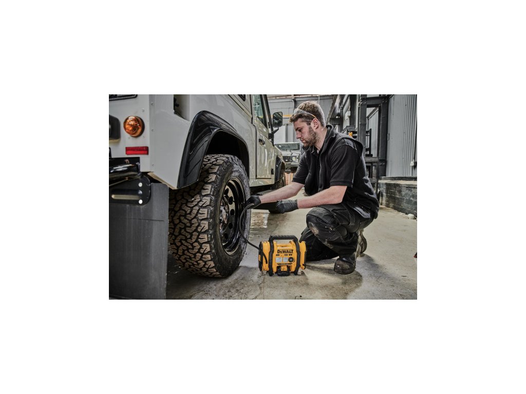 2 dva kvalitné LCD displeje pre jednoduché nastavenie parametrov, LED dióda pre osvetlenie stola, napájanie z troch rôznych zdrojov 18 V batéria DeWALT, 12 V autobatéria alebo 230 V (sieťový adaptér 230 V nie je súčasťou balenia) bez prepínania Vysokotlakový výstup nafúkne pneumatiku 235/70R17 za 400 sekúnd Nafúkne 6 takýchto pneumatík s 4,0 Ah 18 V batériou Veľkoobjemový výstup s hadicou a hubicou pre rýchle nafúknutie a vyfúknutie rôznych predmetov Jednoduché nastavenie rôznych jednotiek (BAR, kPa, PSI) Automatické vypnutie pri dosiahnutí nastaveného tlaku Vstavaný úložný priestor pre adaptéry na hustenie pneumatík, balónovú ihlu a 12V napájací adaptér do auta Sieťový adaptér 230 V je dostupný len ako náhradný diel s číslom výrobku N557515 Technické údaje Typ batérie Li-Ion Vrátane batérie 0 Kapacita batérie (Ah) Dodávané bez batérie Tlak (Bar/PSI) Max /min) 12, 7 Dĺžka hadice vysoký tlak (m) 0,65 Dĺžka hadice vysoký objem (m) 0,45 Typ nabíjačky Dodávané bez nabíjačky Hmotnosť bez batérie (kg) 3,1