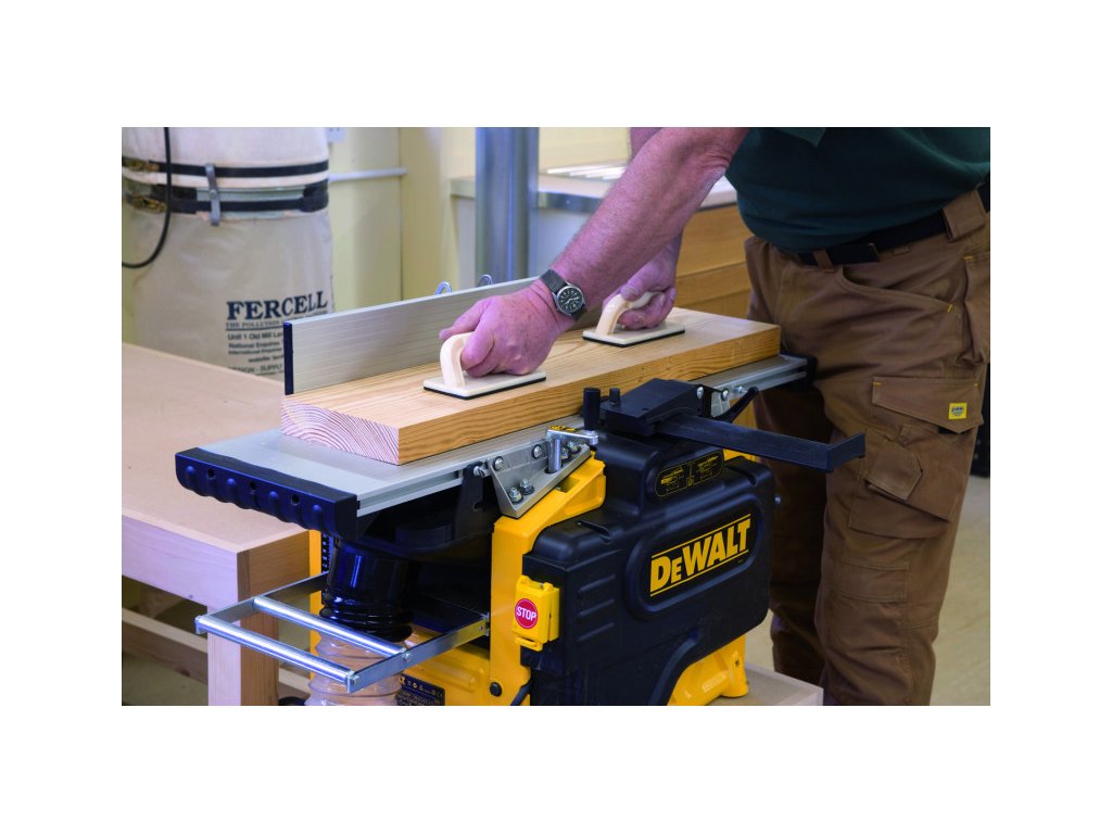 Veľký hliníkový stôl Presné nastavenie množstva odstraňovaného materiálu 100 mm sacia prípojka S nožmi, meradlom, posuvným držiakom a 4 opornými nohami Technické údaje Výkon (W) 2100 Voľnobežné otáčky (f/p) 3300 Napätie (V) 230 Voľnobežné otáčky (f/p) 6200 Max. úber hobľovania (mm) 260 Max. 1 000 × 260 Rozmer zahusťovacieho stola (mm) 500 × 250 Pracovný nástroj max rozmery (mm) 160 Rýchlosť pásu (m/min) 5 Hmotnosť (kg) 53