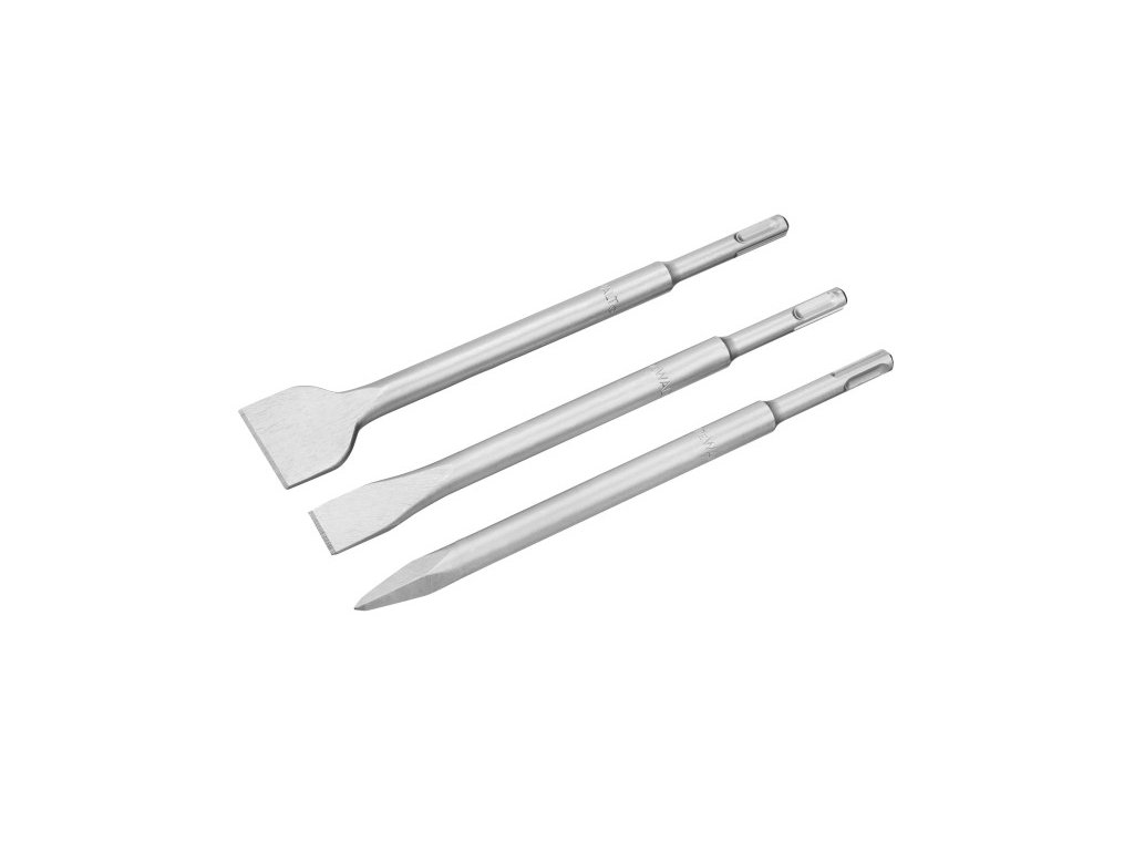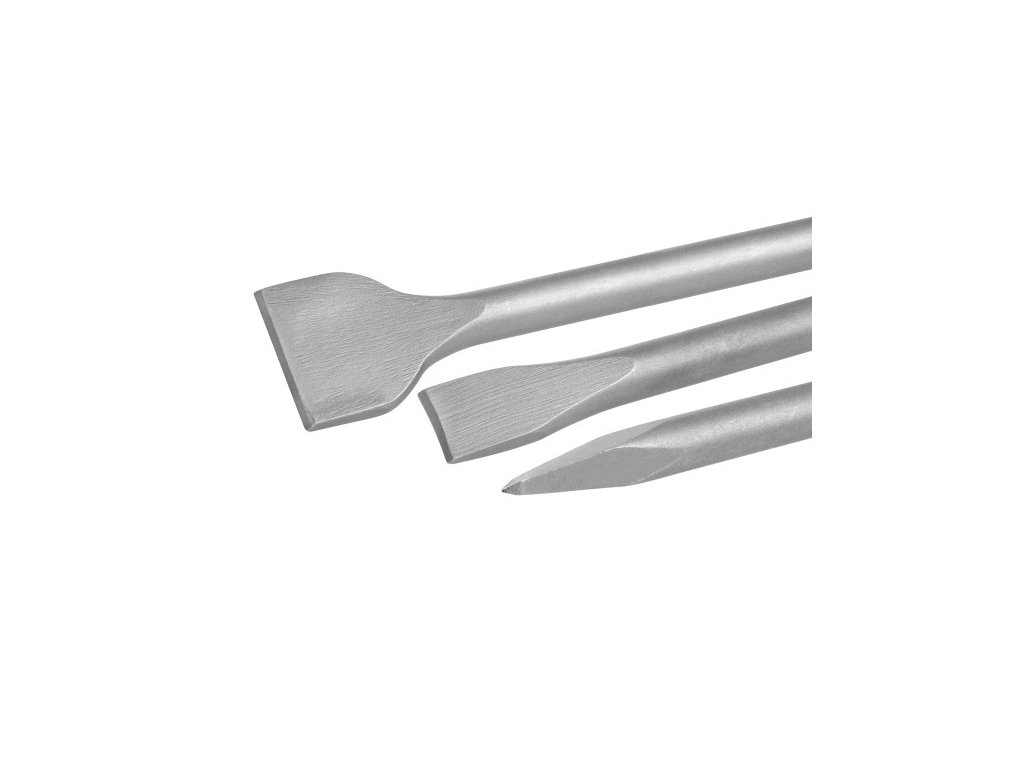 Pre náročné sekacie, drážkovacie a demolačné práce v betóne, kameni (stredná tvrdosť), obkladoch a dlažbách, všeobecnom murive a malte Špeciálne tvrdená oceľ a mikroprocesorom riadená funkcia tepelného spracovania zaručujú trvalo efektívne hroty s dlhou životnosťou Sada obsahuje: 250 mm špicatý sekáč 20 mm x 250 mm plochý sekáč 40 mm x 250 mm plochý sekáč