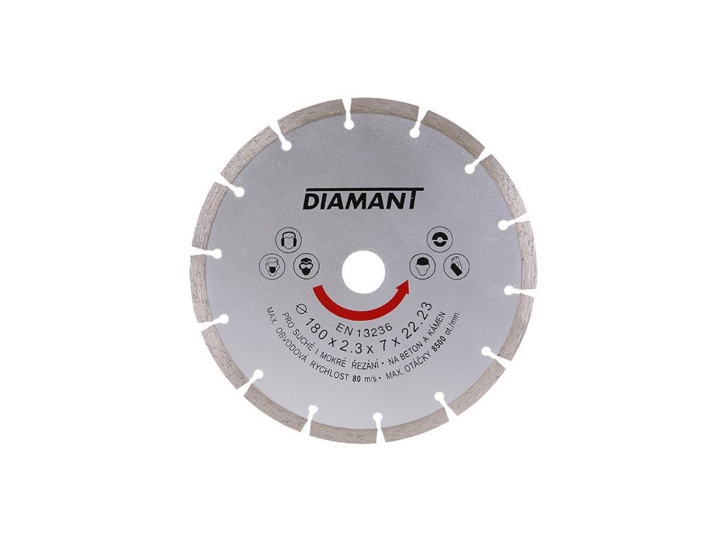 Diamond disc DIAMANT, design: SEGMENTED, high-quality materials and processing - high-strength attachment of diamond segments to the supporting disc of the disc, high content of diamond dust in the segments, use: for dry cutting of concrete, brick, masonry, stone, ..., packaging: blister with euro hole, included reduction ring from 22.2 to 20 mm, dimensions: stated in the product name.