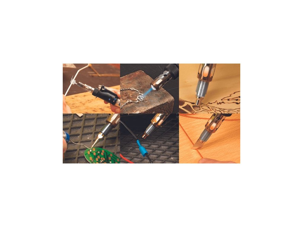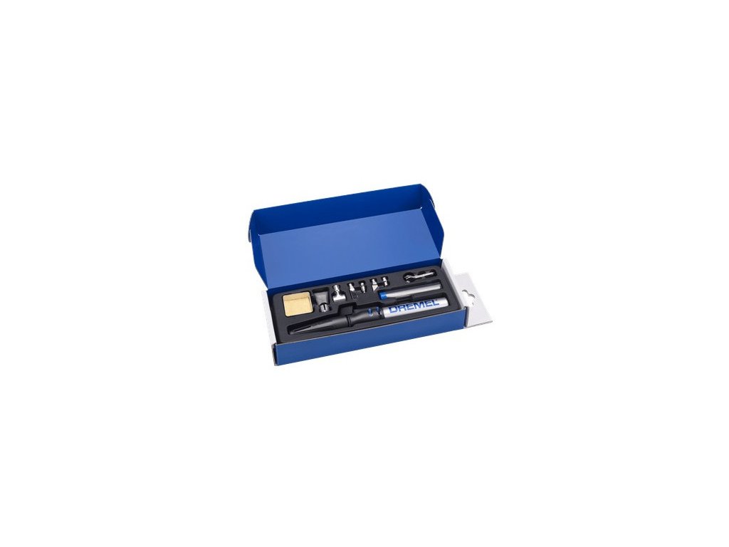 A szerszám hét tartozékot tartalmaz: forrasztóhegyet, melegvágó kést, formázókést, pirográfhegyet, széles lángfejet, forró levegős hegyet és deflektort, amelyek mindegyikét egy adott alkalmazáshoz (pirográfia, vágás és melegítés) tervezték. Ezeket a tartozékokat kiegészíti egy forrasztókészlet, amely forrasztóból, szivacsból, ónokból és csavarkulcsból áll, így teljes felszerelést biztosít a forrasztási feladatokhoz. A használat után a védősapka biztonságos hűlést és tárolást biztosít, mivel megakadályozza a károsodást, és meghosszabbítja a szerszám élettartamát.