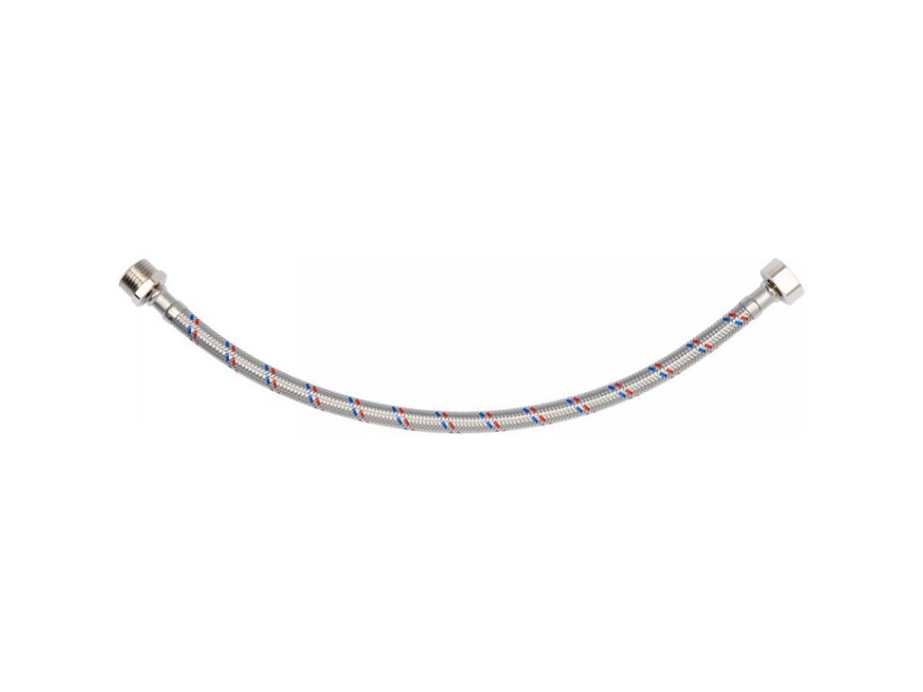 Rugalmas csatlakozócső csaptelepekhez rozsdamentes acélból szőtt. Meleg és hideg vízhez tervezték.
