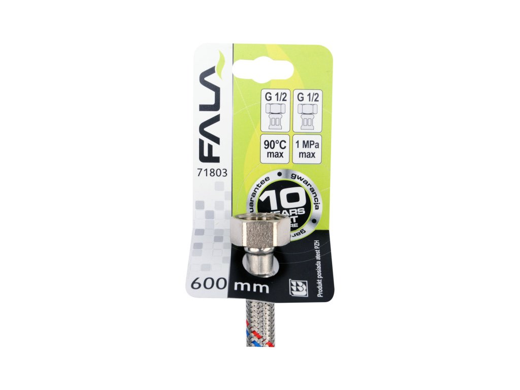 Rugalmas rozsdamentes acél kötőcső. Meleg és hideg vízhez tervezték. PZH minősítéssel rendelkezik az ivóvízzel való érintkezésre. Hossza 600mm. Maximális nyomás 1MPa. Maximális hőmérséklet 90°C. Átlagos átfolyás 32L/perc. Belső átmérő 8mm és külső átmérő 12mm. Csatlakozó menet: belső 1/2" x belső 1/2". EPDM gumi cső, nikkelezett sárgaréz csatlakozók, EPDM gumi tömítés. WC tartályok vagy szelepek csatlakoztatására tervezték.