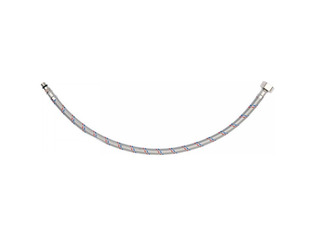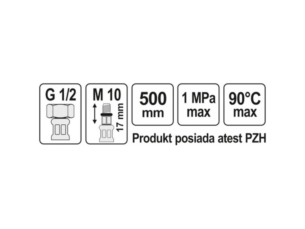 Rugalmas rozsdamentes acél fonatú csatlakozó tömlő csaptelepekhez. Forró és hideg vízhez tervezték. Az PZH által minősített ivóvízzel érintkező anyag. Hossza 500mm. Maximális nyomás 1MPa. Maximális hőmérséklet 90st C. Átlagos átfolyási sebesség 32L/perc. Belső átmérő 8mm, külső átmérő 12mm. Csatlakozási menet: belső 1/2" x külső M10 (17mm rövid). EPDM gumiból készült gumitömlő, nikkelezett sárgaréz csatlakozók, EPDM gumitömítés. Mosdó- és fürdőkád csaptelepek szelepekhez való csatlakoztatásra tervezték.
