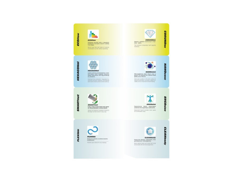- a fej kerámia szafír keménységű szinterrel van felszerelve, melynek felszínén mikroszkópikus üregek találhatóak, amelyek óvják a kenőanyagot a kimosódástól és problémamentes működést garantálnak a csaptelepnek sok éven át
