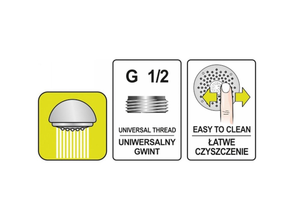 Klasszikus, egyfunkciós zuhanyfej, rugalmas fülekkel, amelyek segítségével könnyen eltávolítható a vízkő. A standard 1/2" csatlakozó révén, illeszkedik a tipikus zuhanyzócsövekhez.
