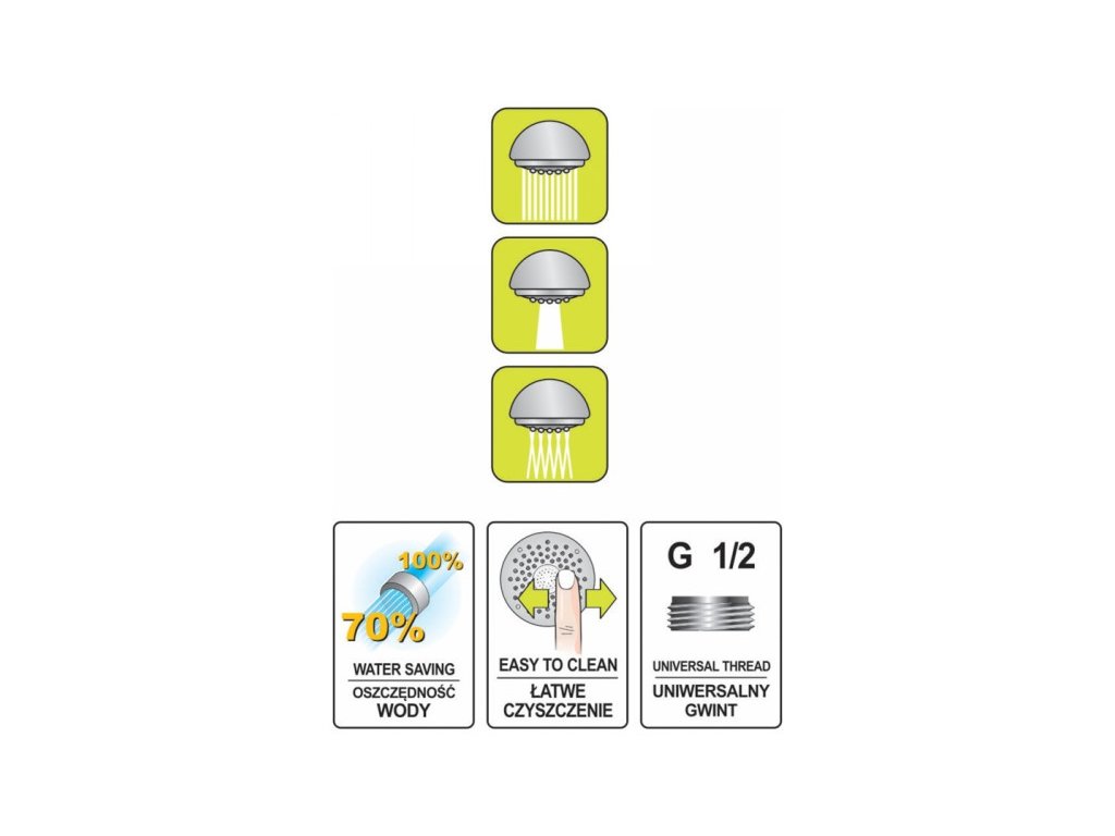 A szilikon fúvókáknak köszönhetően a vízkő eltávolítása nem lesz gond. A csatlakozási átmérő, a G1/2" illetékes minden hagyományos zuhanytömlőbe.