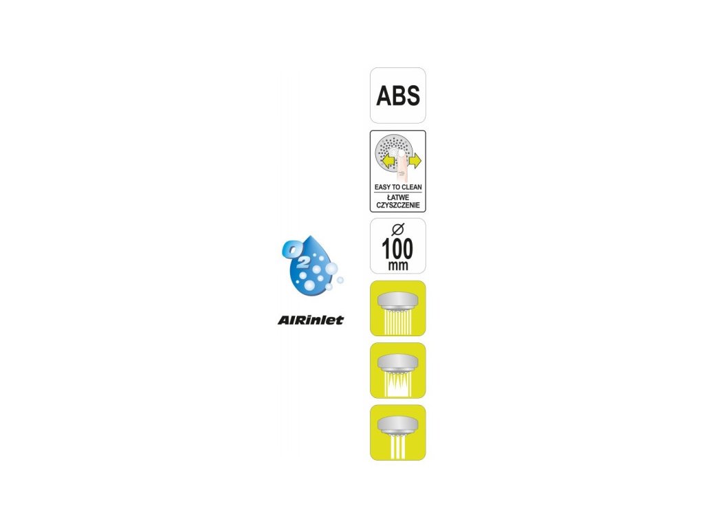 Az alkalmazott AIRinlet technológia a levegőt beszívja a fejbe és hatékonyan keveri a vízzel, hogy növelje a vízsugár térfogatát.