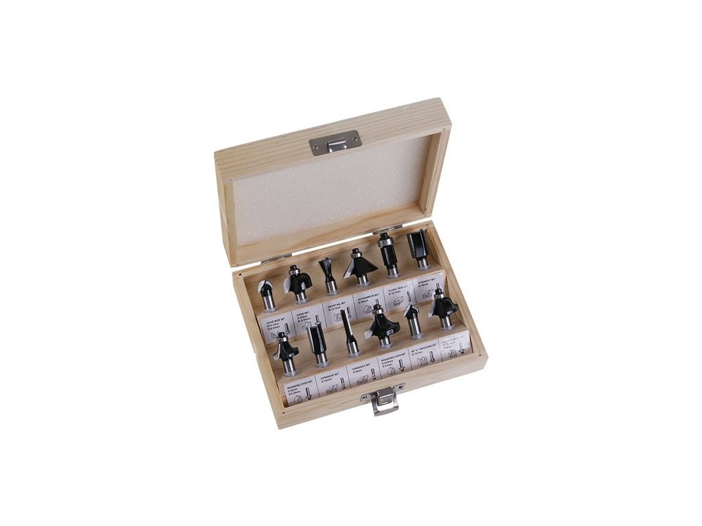 Shape cutters for wood - set of 12 pcs, the cutters are equipped with high-quality SK blades, various types of shape cutters without or with a guide wheel and a high-quality bearing, use: for milling grooves and edges of various shapes, shank 8 mm, packaging: Wooden box.
