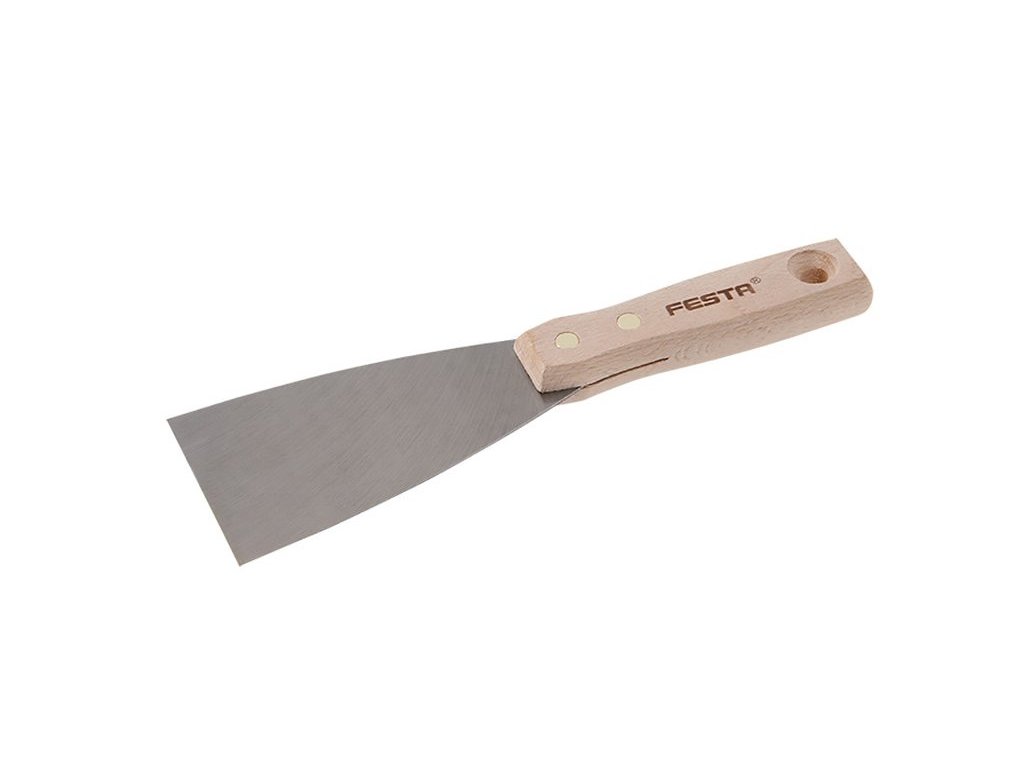 Painter's trowel (spatula) with a ground steel blade and a wooden riveted handle. Painter's trowels are used for filling holes, scraping off excess material, etc. Blade width: 80mm