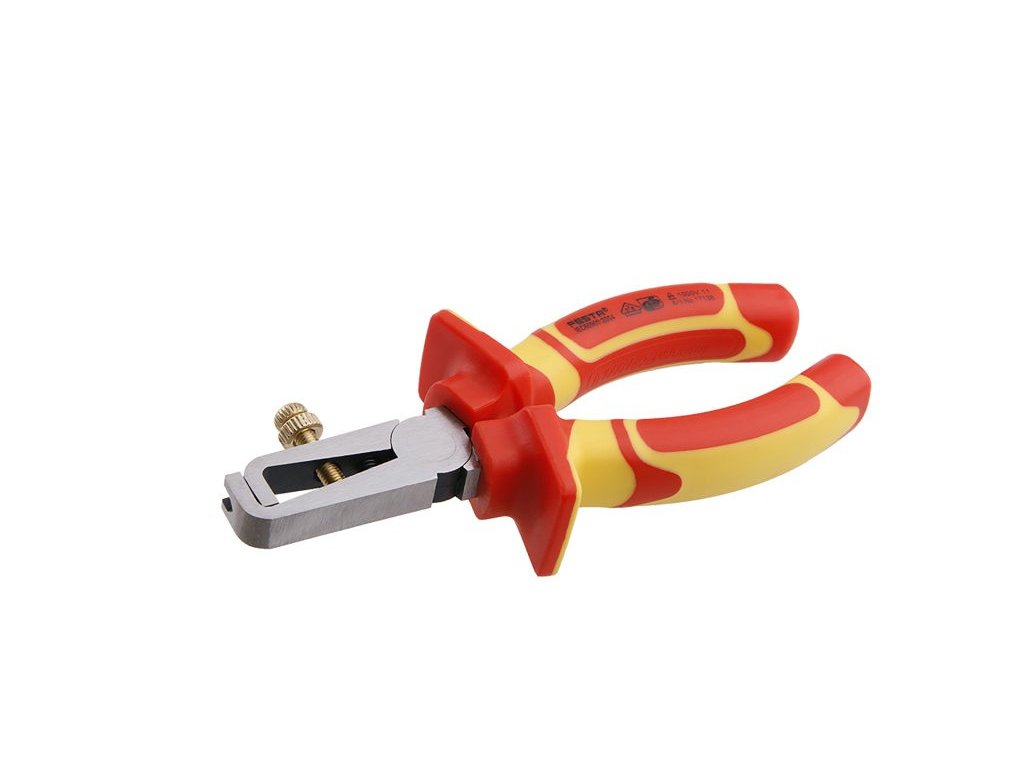 The VDE stripping pliers 160 mm FESTA are certified electro VDE 1000 V, IEC/EN 60900-2004, the combination of polypropylene and rubber on the ergonomically shaped handles guarantees excellent anti-slip properties and good resistance to lubricants and chemicals. Gripper jaws particularly wear-resistant, chrome vanadium high-performance steel. Weight 0.283 kg.