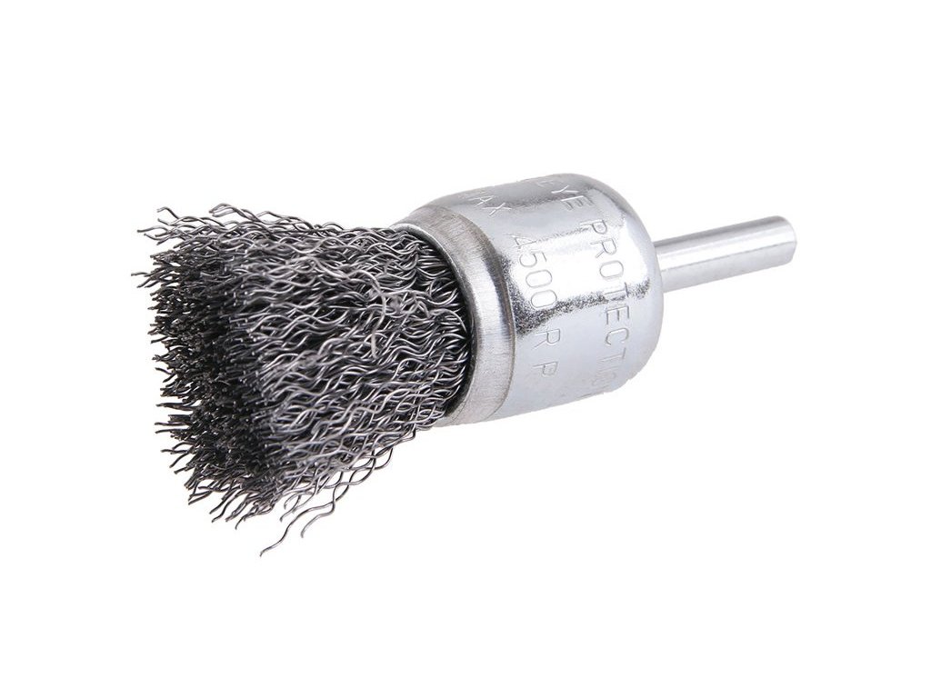 Rotary brush - wavy, FESTA brushes guarantee high-quality materials and processing, wire 0.3 mm diameter 25 mm, stem 6 x 20 mm, galvanized brush body, number of wires: 150, wire length: 20 mm, max. permissible revolutions: 4500 1 /min, use: light sanding work and cleaning in hard-to-reach places, packaging: blister with euro hole.