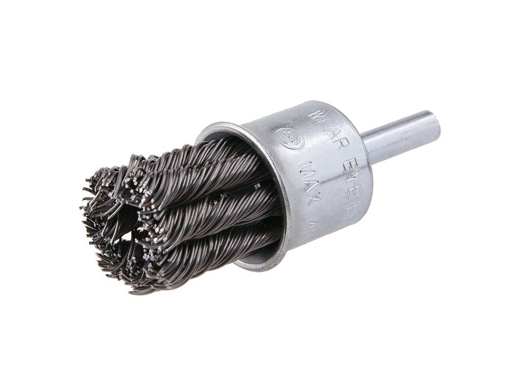 Rotary brush, version: COPY - patented wire 0.5 mm - copy, does not unravel even under extreme load, FESTA brushes guarantee quality used materials and processing, steel wire 0.5 mm, diameter 26 mm, shank 6 x 27 mm, galvanized brush body, number of wires: 370, wire length: 28 mm, max. permissible speed: 4500 1/min, use: light sanding work and cleaning in hard-to-reach places, packaging: blister with euro hole.