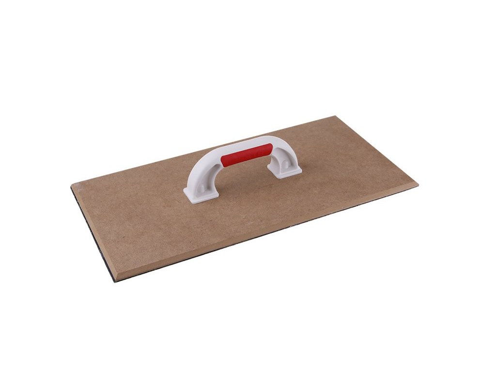 Sanding trowel for polystyrene 500 x 250 mm, sanding paper grit 16. It is made of so-called MDF board, which means medium density wood fiber board. The handle is made of solid plastic and is firmly connected to the trowel. The sanding trowel (sandpaper) is intended for the alignment (sanding) of facade polystyrene, hardened polystyrene and extruded polystyrene.