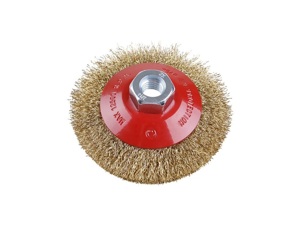 Rotary brush - cup, FESTA brush guarantees quality used materials and processing, corrugated wire - brass-plated 0.3mm, diameter 100mm, M14 attachment, number of wires 1800, maximum revolutions per min. 12500, use: for removing rust, paint, polishing.