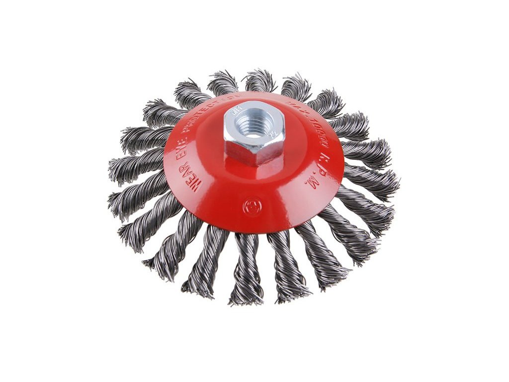 Rotary brush - cup, design: COPY - patented wire 0.5 mm - copy, do not unravel even under extreme load, diameter 125 mm, thread M14x2 mm, number of wires: 900, wire length: 23 mm, max. permissible revolutions: 12500 1 /min, use: removal of paint, rust, burrs, welding residues, slag, roughening, cleaning of metal parts